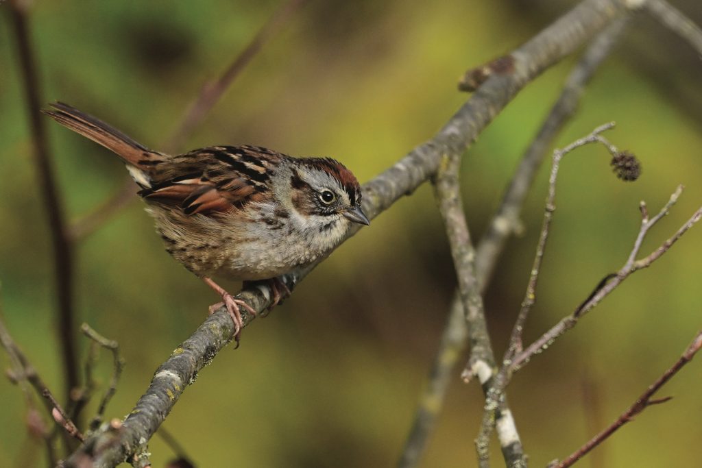 At this time of the year, these medium-sized sparrows are a warm brown above with black streaking — like so many others — but swamps have a significant amount of chestnut apparent in the wings. The gray face, dark eye line and crown streak contrast sharply with the white throat and breast. The tail is relatively long and rounded, a very good rudder for moving around in the tight quarters where these birds live.
