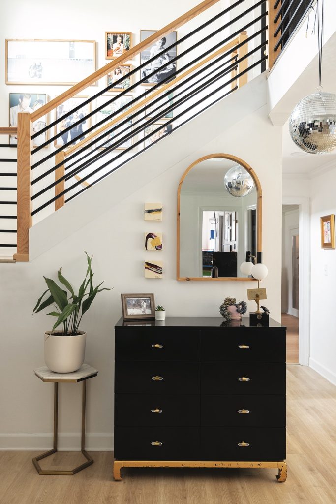 Previously, the entry housed a dated grandfather clock where you’d expect to find a secret passage leading upstairs — just like the one in the 1980s sitcom Webster. Now, the wall is open and freshly updated with visible stair railings that have been given a modern look inspired by an image Jordan spied on Pinterest. Donny ran with it, Jordan says. “They just figured it out and they built that.”