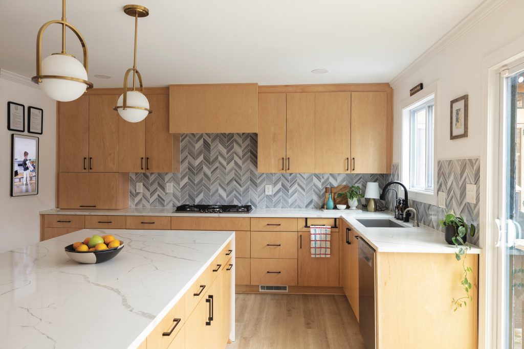 The bright, modern kitchen now faces the backyard, where they extended the deck — the “brilliant idea” of Jordan’s mom, who let the family and their dogs crash with her during renovations. (Sandi, as it turns out, loves to spend time on that very deck, sitting by the pool in the summertime.) Light, warm wood cabinets pair with cool, gray, chevron backsplash tiles and white quartz countertops with gray veining. An island with a waterfall countertop offers seating for casual family meals.