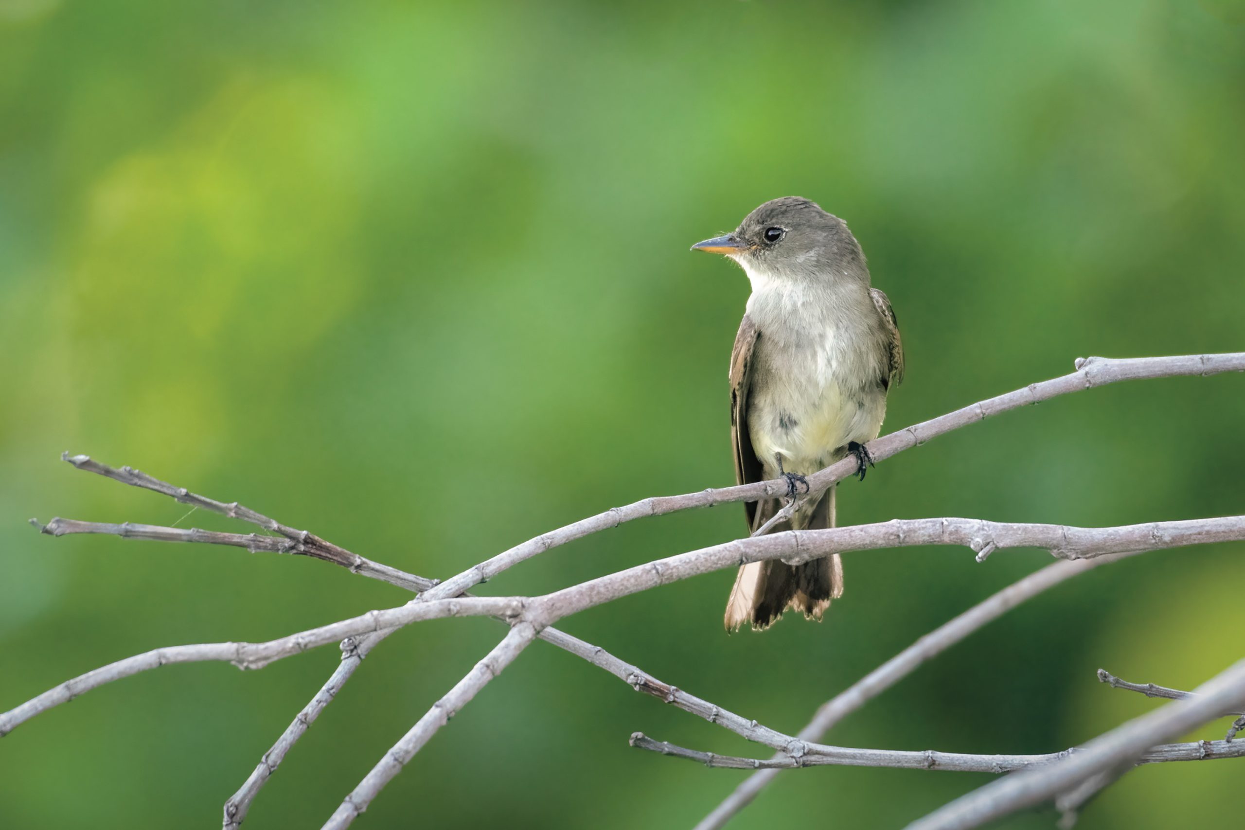 Flycatchers found in the Eastern United States are, as a whole, not a colorful bunch. They tend to be brownish with subtle differences in bill shape, tail length or the color of the small feathers on the wing or around the eye. Habitat may lend a clue, since they have preferences for different types of vegetation. When they vocalize, however, it is a different story. In fact, the eastern wood-pewee has virtually indistinguishable plumage from the western wood-pewee, which is found closer to the West Coast. The western wood-pewee makes a nasal “bree-urr” call that has a much rougher quality in tone. These birds may give a thin, whistled “peeaa” as well. Generally, the quality of the vocalizations is very different from that of our Eastern birds.