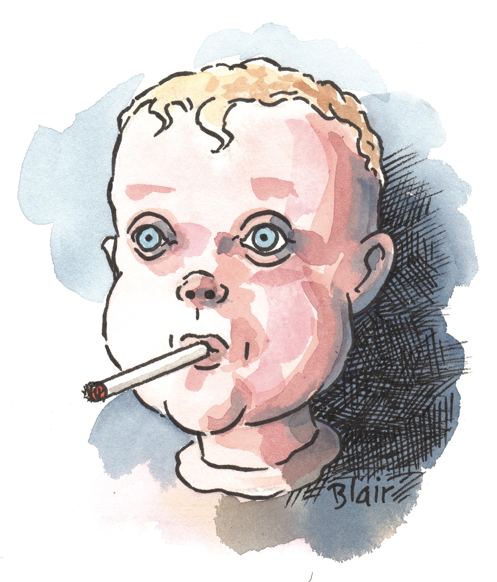 The ciggie, a fake one I’ve used in a cigarette holder when I dressed as a flapper for a Halloween party, appears lighted. This took Gerber baby to another dimension. Unexpected. Unsettling.