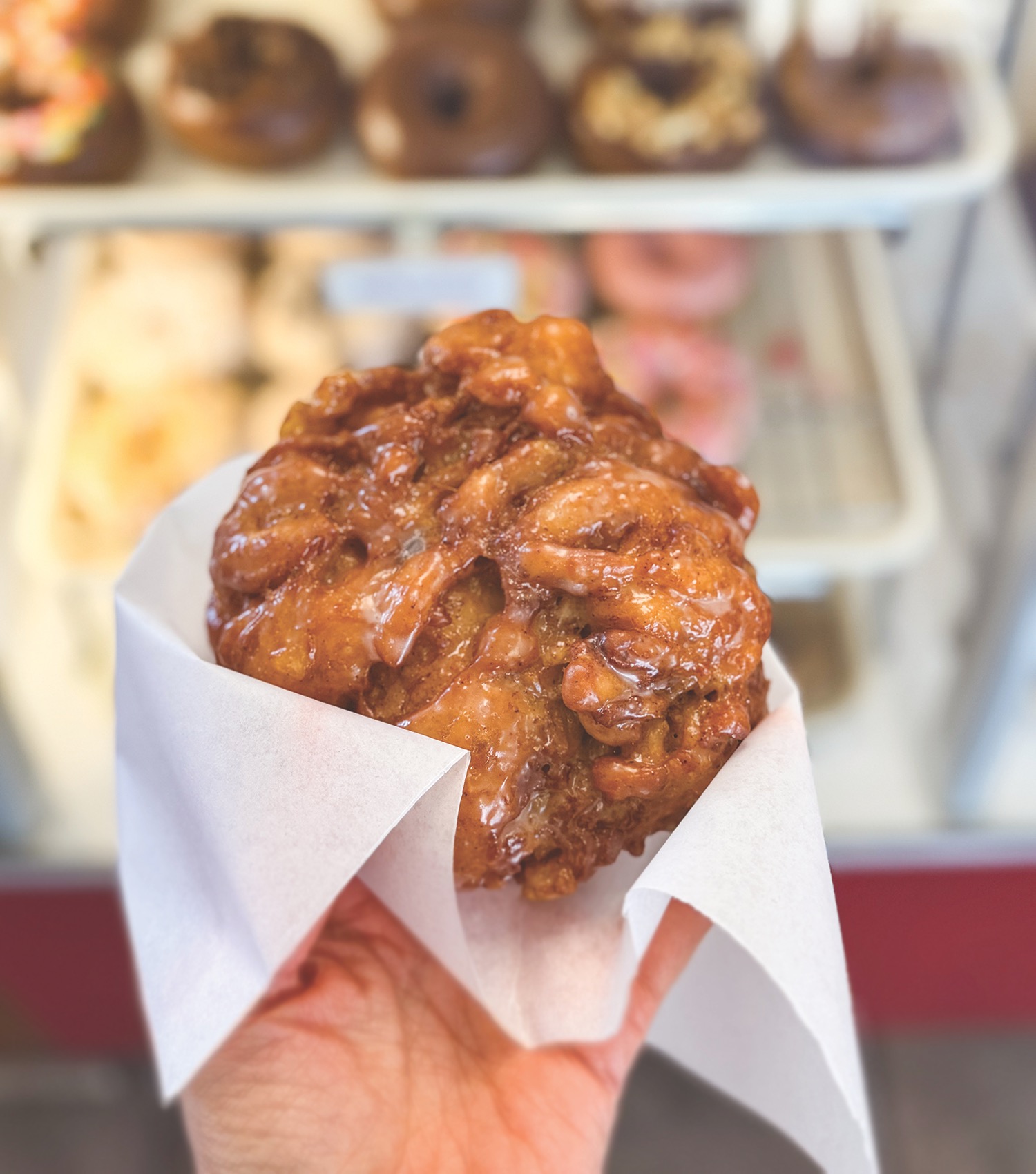 “May I have an apple fritter, please,” she says, gesturing to the dozen fritters behind the glass, arranged in a glistening grid on a parchment-papered baking tray.