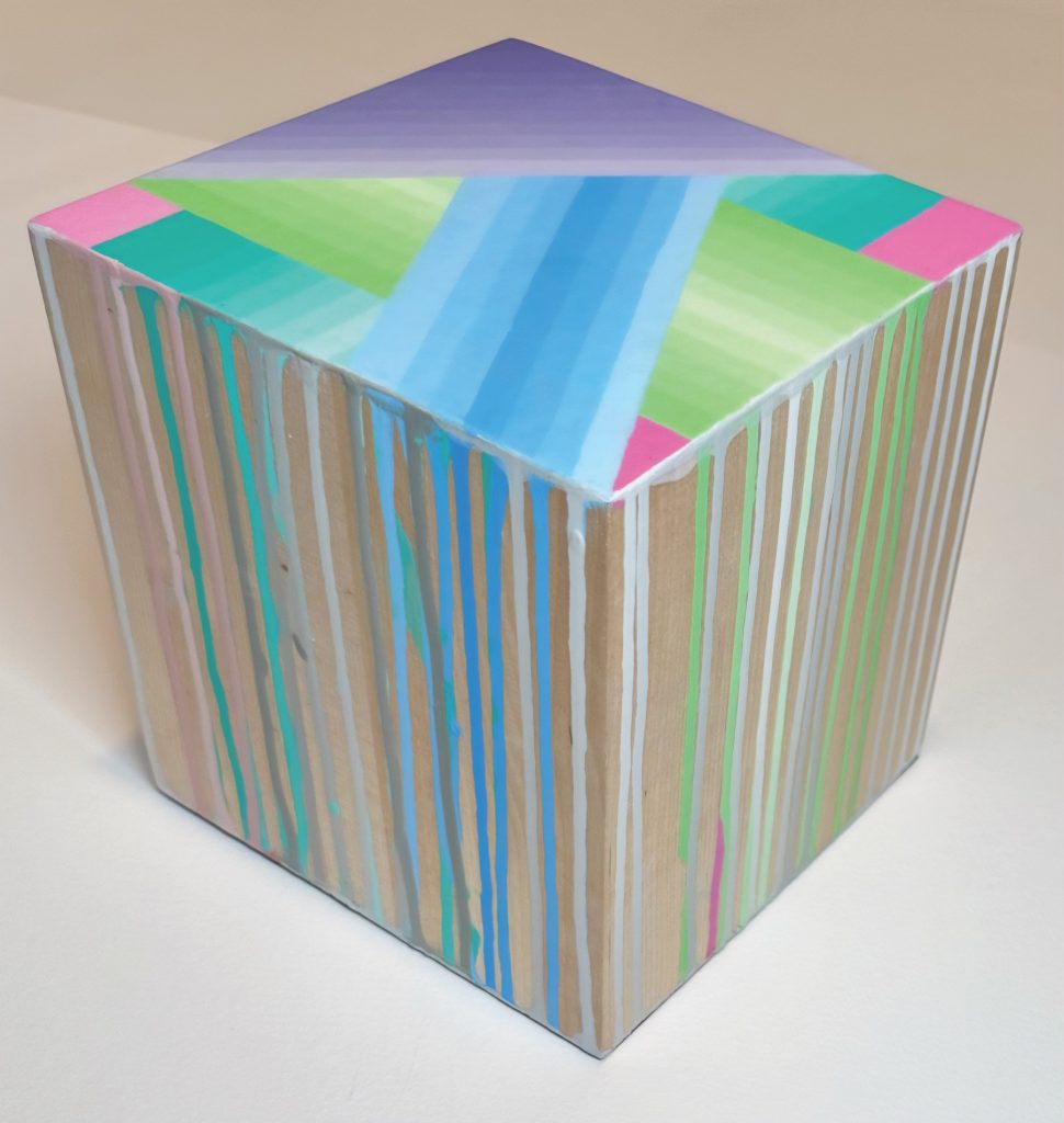 “What I’ve realized, regarding how long I’ve been doing it, is that you don’t get better, you just change,” says artist Matthew Micca, whose work will be featured at GreenHill Center for NC Art beginning April 10. Micca, an Asheville resident and contemporary abstract artist who breaks the mold, strives to always produce art that he’s proud of — even if it’s something that has completely strayed away from his norm. From drawing illustrations in his earlier years to falling in love with abstract art, Micca has decided to set aside his panel paintings and, instead, try out three-dimensional cubes that encapsulate his contemporary artist mind. “About a year and a half ago, I figured out how to merge my paintings and bring it to the 3D realm in a way,” he says. He found the switch from 2D to 3D to be easier than expected. His technique involves painting his design on one flat surface of the cube while the excess paint drips down its sides. Asked what he thinks about his previous work, he says: “I recognize that it’s good, but I can’t do that now because I’m past that.” Art, Micca says, is ever changing and constantly moving. He wishes more artists would take risks and evolve their art, which, if you can pluck up the courage to do so, can pull you out of your comfort zone and into daring and bold expression. “I think I’ve gotten braver through the years,” he muses. While his work has changed over time, one thing has remained the same: “My work has always been a mix of geometric and organic forms.” While his shapes, patterns and evolving mediums allow him to express himself, he’s fascinated by viewer interpretations as well. “I love to hear what people see in my work,” he says. So when you catch Micca’s solo exhibition of his 3D-cube work at GreenHill Center for NC Art through June 20, be sure to let him know what you see. Info: greenhillnc.org/exhibitions.