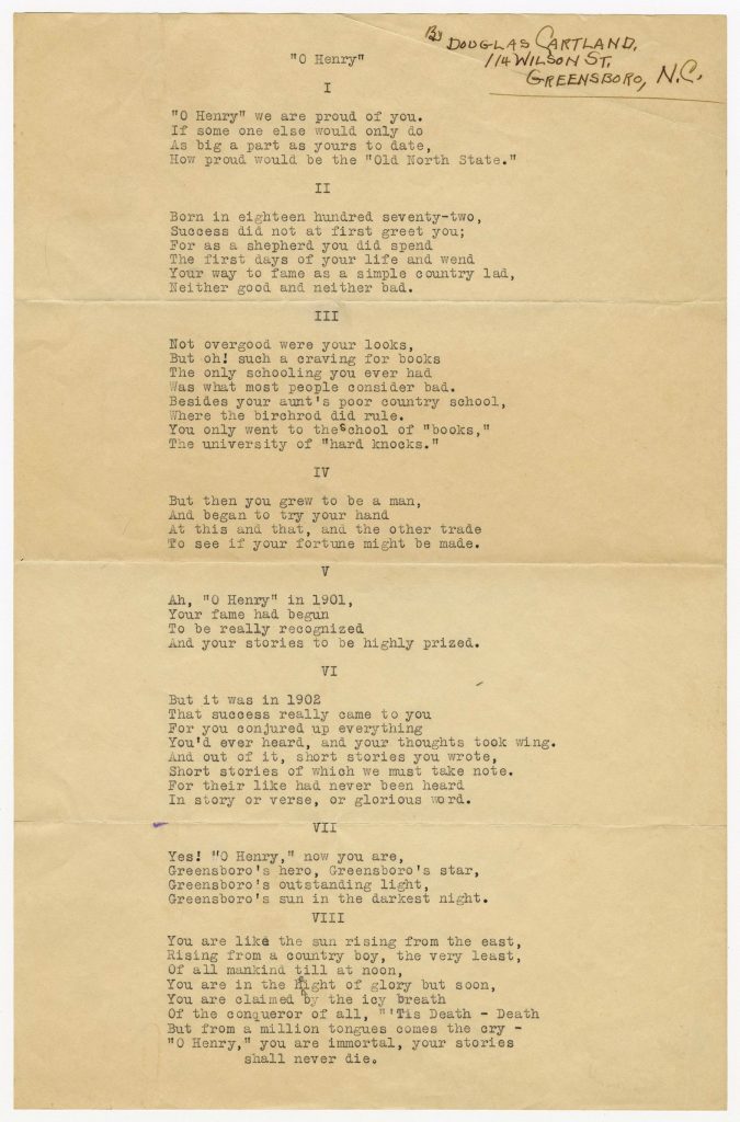 For National Poetry Month, we wanted to highlight the work of a not-so-ancient poet — and no, we’re not talking about Shakespeare. Douglas Cartland, a Gate City resident in the early 1900s, wrote a poem about renowned Greensboro-born writer William Sidney Porter, better known as O. Henry. Cartland calls him “Greensboro’s hero, Greensboro’s star, Greensboro’s outstanding light, Greensboro’s sun in the darkest night.” With words like these, Cartland may have just fancied himself the ‘Boro Bard.