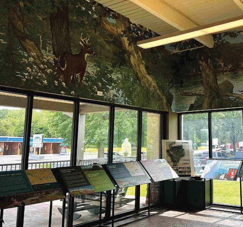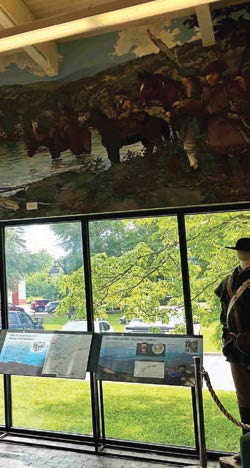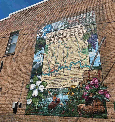 Walking past an old train car, we soon arrive at the Yadkin Valley Heritage & Trails Visitor Center at 257 Standard St. Another massive Michael Brown work highlights the story of the Revolutionary War’s Overmountain Men, who crossed the Yadkin River on their way to King’s Mountain, S.C. Inside, we learn how far back Elkin’s history goes, back to when Sioux Indians settled along the Yadkin River as early as 500 B.C.