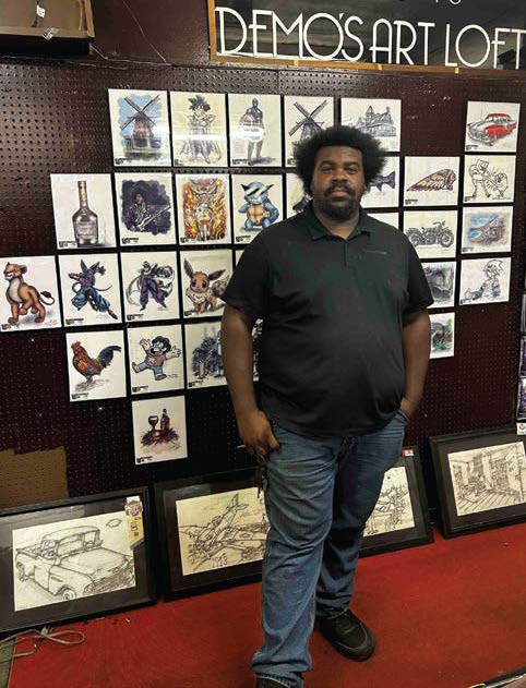 Walker, who opened his store in 2017, uses different mixed media, from graphite, ink and watercolor to 2D and 3D printing and woodworking. He has a knack for landscapes, portraits and unique anime creations. After I buy three of his framed prints, he asks, “Do you want to see the phonographs downstairs?” Meeting Tom back at the main level, the three of us venture to the basement, where a treasure trove of beautiful, ornate, hand-cranked phonographs from the early 1900s awaits. Their intricate oak and mahogany cabinets are etched, some with decorative red roses and green vines.