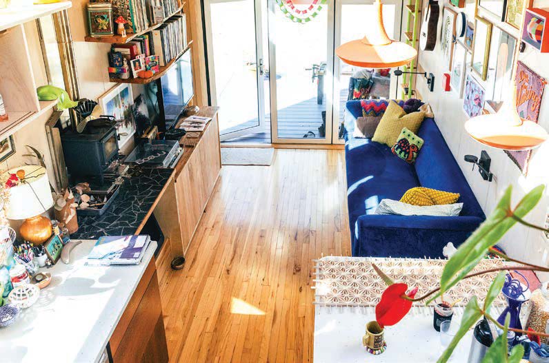 Rachel’s most recent touch to the home interior is a bold and vibrant floral wallpaper hung by the back door. The colors mimic that of Zaara’s bedding, though more saturated and with hints of Rachel’s second-favorite color, magenta. She painted the adjacent door in a dark teal shade, though, she notes, “It’s got some scratchies because of the dog — you know!”