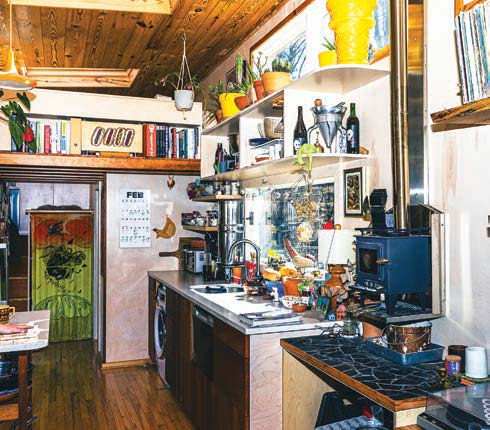 For the kitchen bar area, Rachel selected a blue-and-gold wallpaper featuring whimsical stems of wildflowers. She found sturdy wooden shelves on Etsy. Najib installed both the wallpaper and the shelves. But the nook’s pièce de résistance is framed artwork, swirls of red with splashes of green and purple. “That’s one of Zaara’s first little finger paintings,” says Rachel proudly.