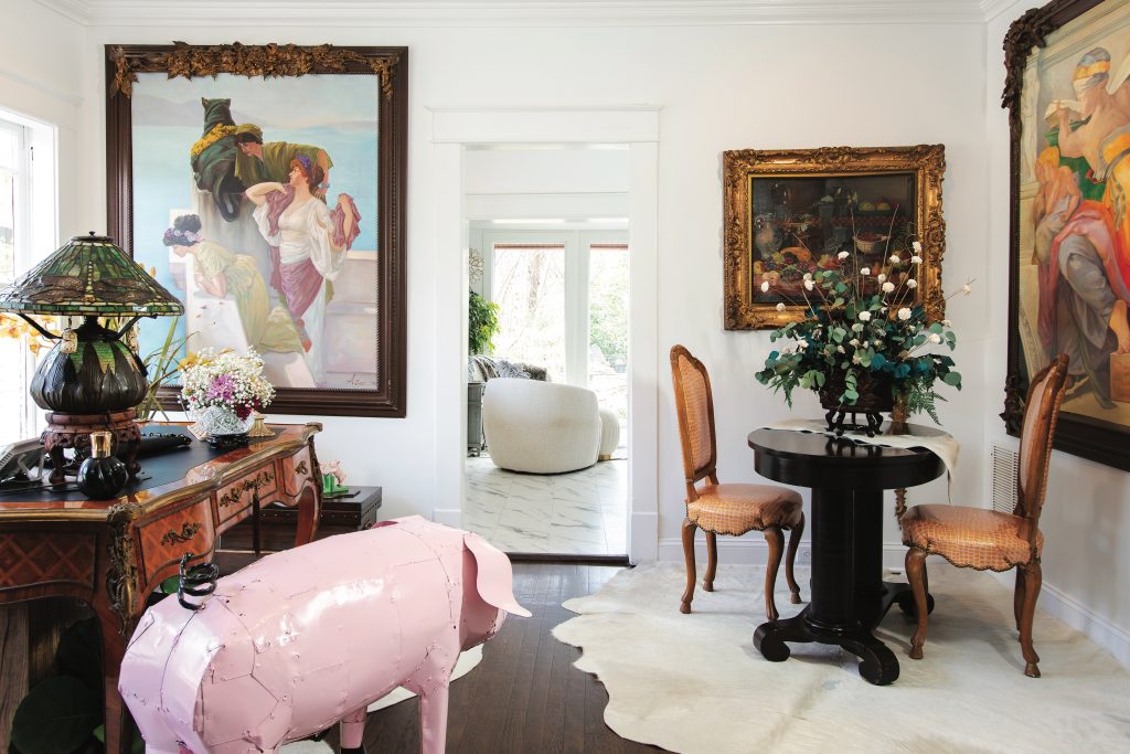 In the entry, a painting of a woman wearing a blue-and-white striped dress holding a little girl’s hand as they walk through a field of poppies and larkspurs hangs in a gilded frame. The artist’s initials? “N.A.”