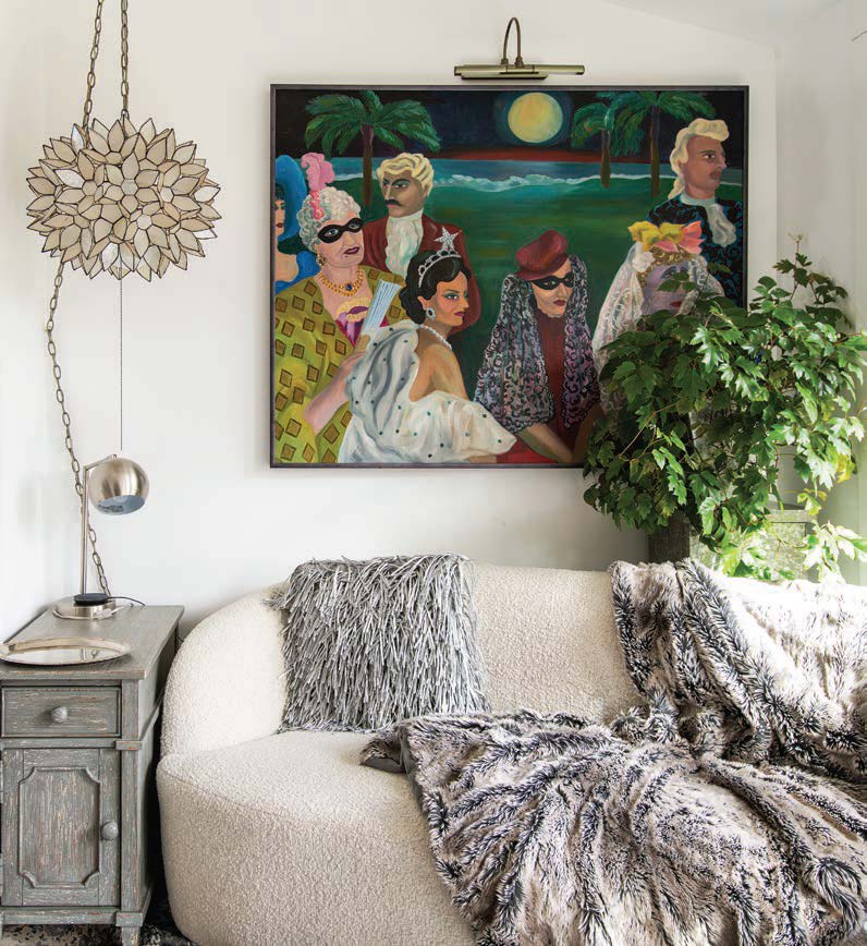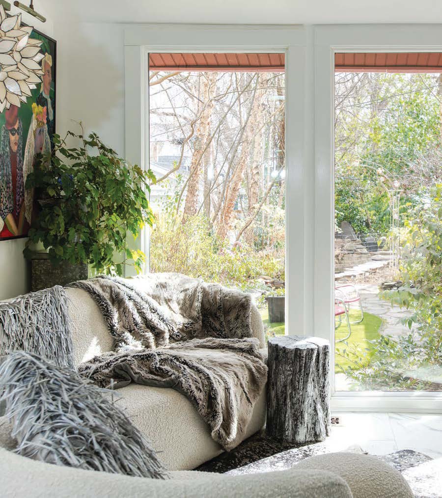 A moss-covered fairy house decorated with purples and oranges sits on a table below the painting. Najib’s friend, Nick, gave Zaara the kit for Christmas. “It’s just too good to put outside,” quips Rachel, “so it’s just part of the home decor!”