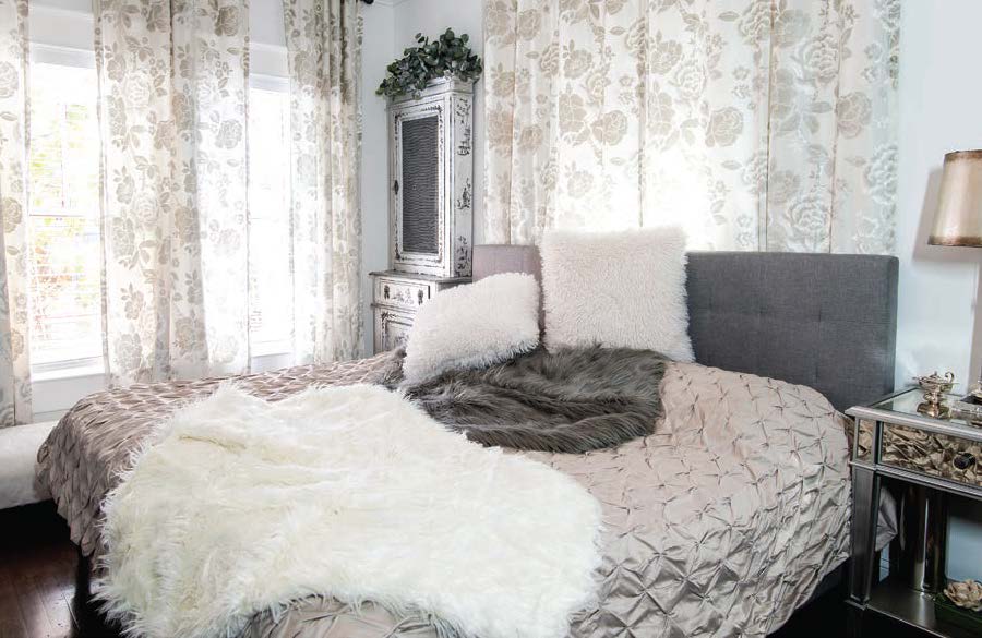 As it turns out, the timing was impeccable. Just a week after going under contract, the couple found out they were expecting. Naturally, the first room they tackled was Zaara’s nursery, which has since transitioned into her “big-girl” room. The walls are a soft, ballet-slipper pink, the windows are flanked by tonal pink, floor-length drapes, and the bedding features blooms in rosy pinks and golden yellows with stems of sage green, lady bugs scattered here and there. On her corner bookcase, overflowing with board books, a vase holds a bouquet of dried wildflowers, special to Rachel because they’re from the arrangements she made for Zaara’s first birthday, where the theme was “Wild One.”