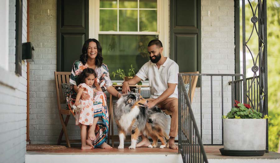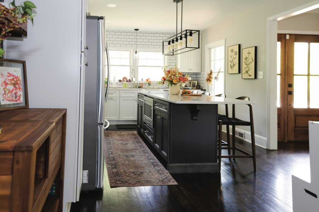 Formerly, the single-family house was a duplex, says Rachel Azam, who currently shares the home with her husband, Najib, their 3-year-old daughter, Zaara, and her 18-year-old stepson, Khalil, who attends the North Carolina School of Science and Mathematics and will head to UNC-Chapel Hill in the fall. And let’s not forget Sophie, the family’s blue-eyed Aussie, a glutton for belly rubs. Originally from Pleasant Garden, Rachel recalls often cutting through Sunset Hills when she was a child. “I grew up watching this house change color,” she muses.