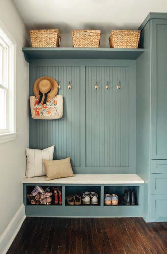 That once blank wall is now a functional built-in. Emma maximized the limited space, designing cabinetry custom-made by Greg Van Wyk, owner of Foxbury Woodworks in Oak Ridge. Greg installed and painted it — blue-green, naturally.